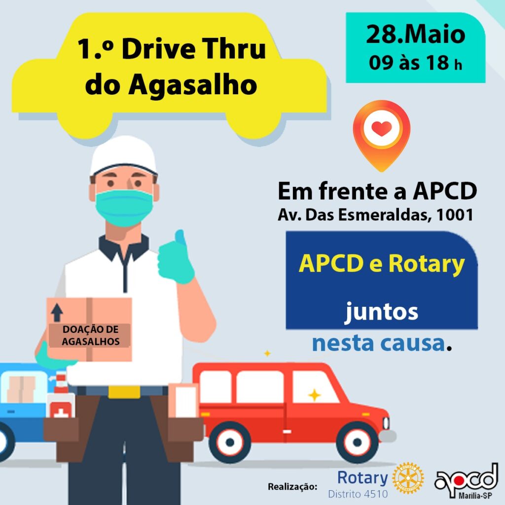 A APCD Marília em parceria com o Rotary Distrito 4510, estará realizando o 1° Drive Thru do Agasalho no dia 28 de Maio, das 9h às 18h em frente a APCD (Avenida das Esmeraldas, 1001).