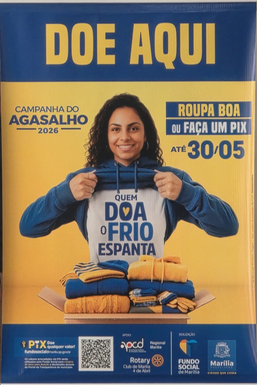 Com o lema “Quem doa, o frio espanta!”, a campanha tem como objetivo arrecadar roupas, cobertores e recursos financeiros para atender pessoas em situação de vulnerabilidade durante o inverno. A ação é promovida pelo Fundo Social de Marília, em parceria com a APCD Regional Marília, o Rotary Club de Marília 4 de Abril e o 6º Drive Thru do Agasalho.