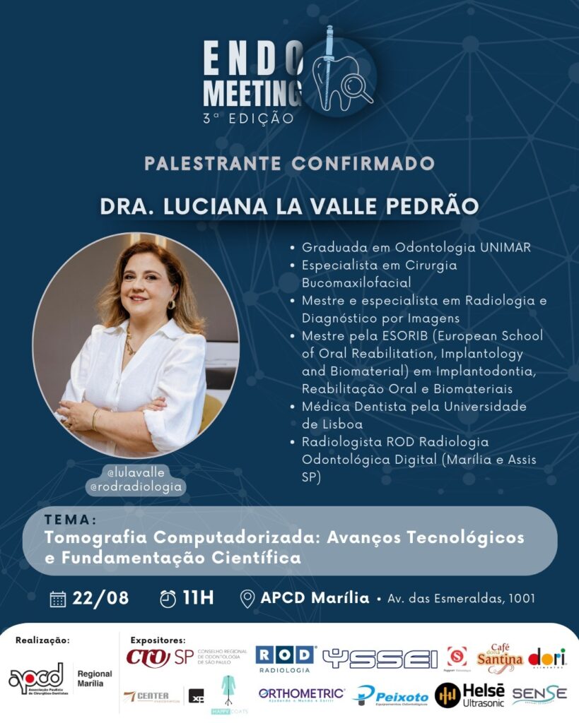 Um dos grandes destaques da programação é a palestra da Dra. Luciana La Valle Pedrão, referência nacional em radiologia odontológica. Com mais de 25 anos de experiência e reconhecida por ser pioneira na implantação da radiologia 100% digital no Brasil, Dra. Luciana conduzirá a palestra: