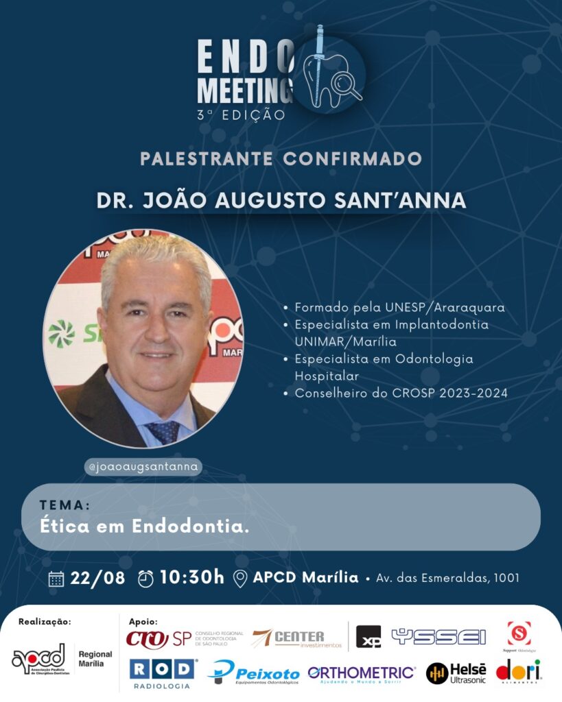 A palestra será conduzida pelo Dr. João Sant’Anna, conselheiro do CROSP (Conselho Regional de Odontologia de São Paulo), que trará uma abordagem objetiva e enriquecedora sobre os preceitos éticos que regem o exercício odontológico, especialmente no contexto da Endodontia.