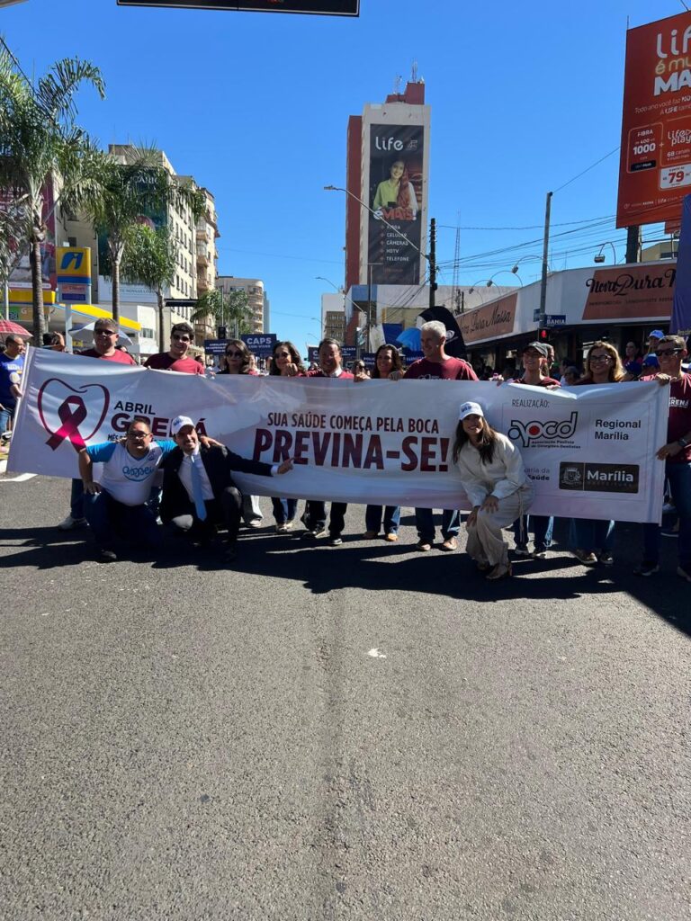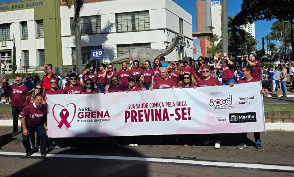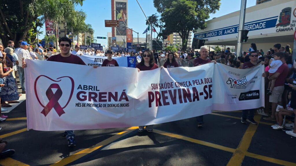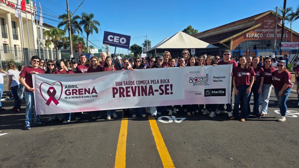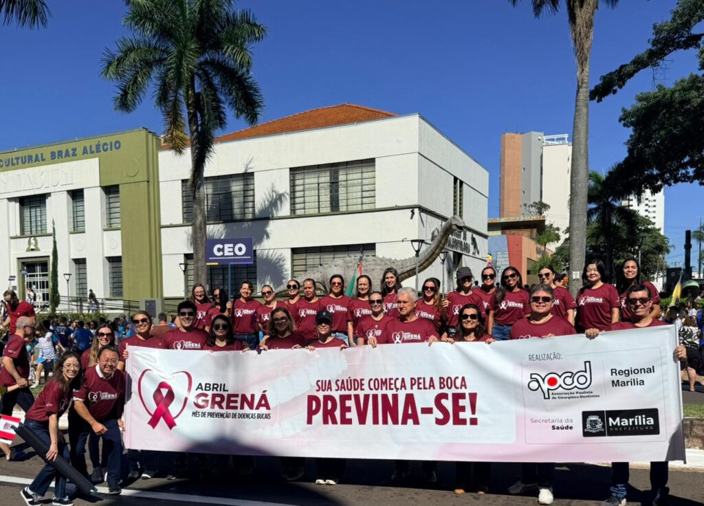 A Associação Paulista de Cirurgiões Dentistas de Marília participou do tradicional desfile cívico em celebração aos 97 anos de Marília, que ocorreu no dia 4 de abril, levando às ruas uma importante mensagem de conscientização sobre saúde bucal. Ao lado da Secretaria Municipal da Saúde, profissionais e familiares destacaram a campanha Abril Grená, reforçando a importância da prevenção, do diagnóstico precoce e dos cuidados diários para garantir mais qualidade de vida à população.