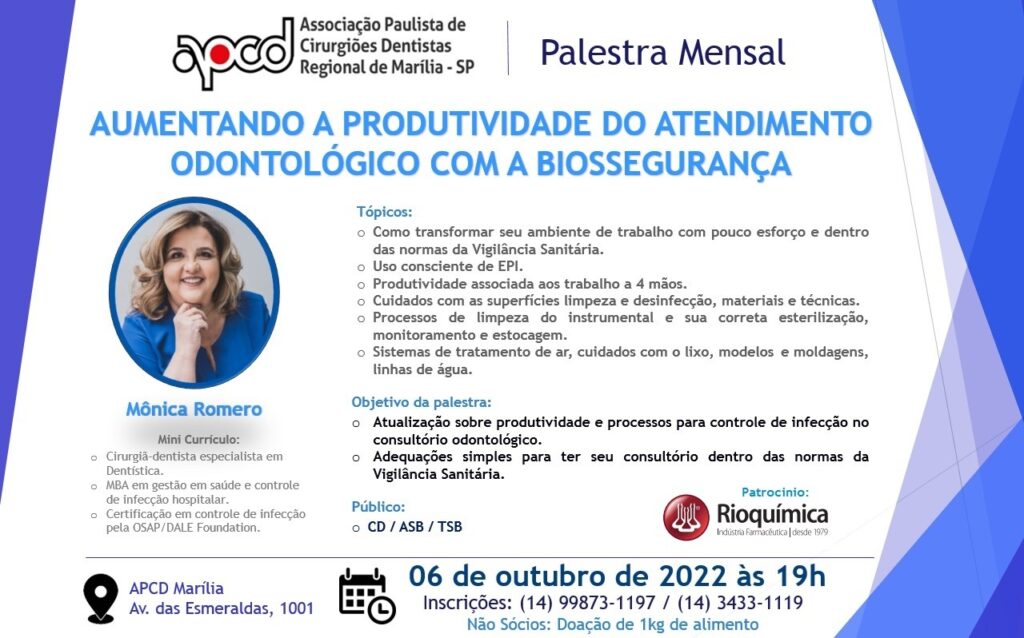 A APCD Marília convida a todos para participarem de mais uma palestra mensal APCD que traz o tema: “Aumentando a produtividade do atendimento odontológico com a biossegurança”, com a Dra. cirurgiã-dentista, Mônica Romero. A palestra será no dia 06 de outubro, a partir das 19h.