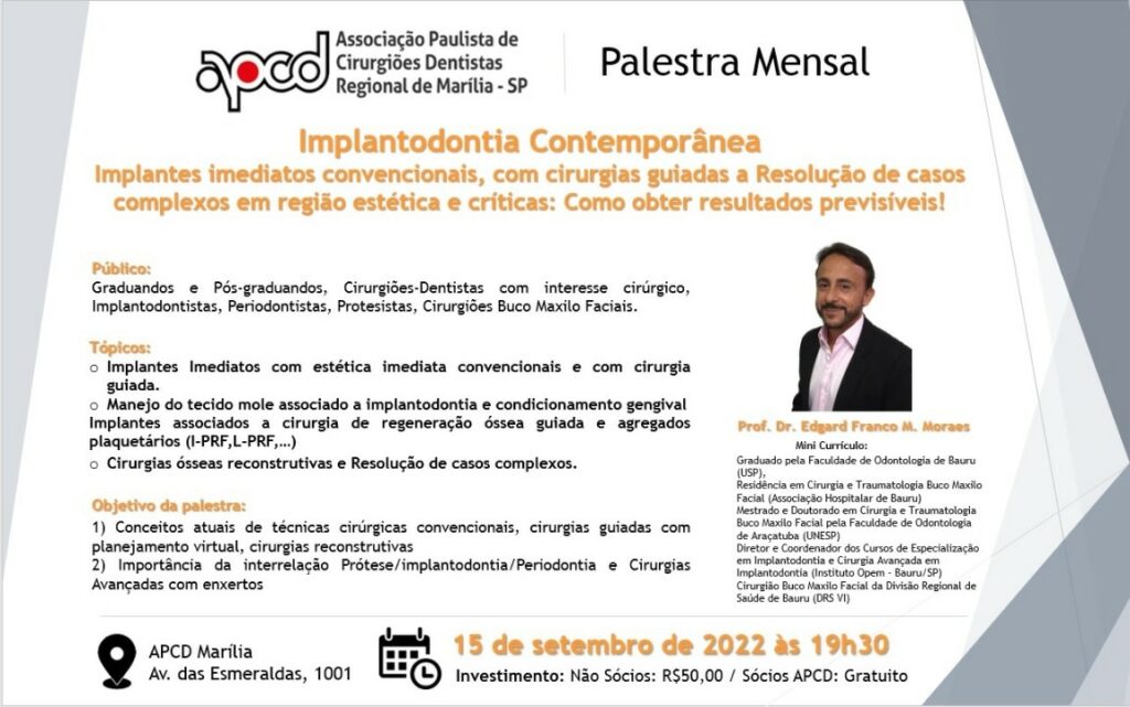 A APCD Marília convida para a Palestra Mensal APCD do mês de setembro, o tema deste mês é Implantodontia Contemporânea, com o Prof. Dr. Edgard Franco M. Moraes.